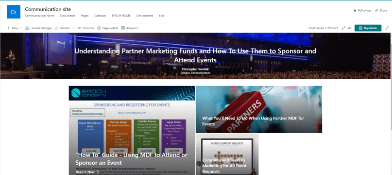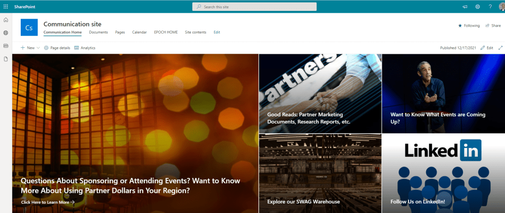 This is a Sharepoint site I built for an IT reseller to the federal government. It’s designed to offer a one-stop-shop for Sales to find information about events, research reports, and more.
