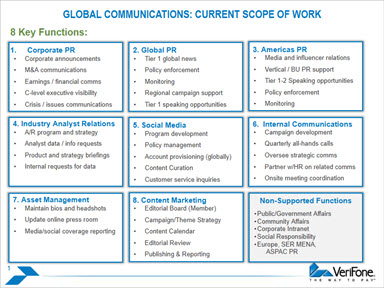 Global Marcoms Responsibility Matrix – An executive-level slide for presenting my fully built-out Global Communications program at Verifone.